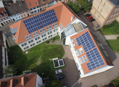 Der Stromverbrauch der Verwaltungsgebäude ist wegen Servern und der Klimatisierung von Archiven vergleichsweise hoch. Mit der Kombination von Photovoltaik-Anlage und Blockheizkraftwerk wird sowohl im Sommer als auch im Winter Strom erzeugt, der größtenteils selbst verbraucht wird. Die 44 kWp-PV-Anlage wurde auf den Eigenverbrauch ausgerichtet: 85% des erzeugten Stroms wird selbst verbraucht. Für die PV-Anlage wurde eine Lösung gefunden, die der Gestaltungssatzung für den Altstadtbereich der Stadt Speyer Rechnung trägt.