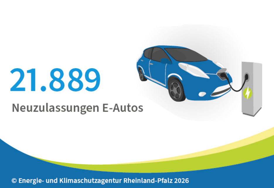 2025 wurden in Rheinland-Pfalz 21.889 E-Autos neu zugelassen. Das ist ein deutlicher Anstieg gegenüber 2024 mit rund 16.000 Neuzulassungen. Insgesamt verzeichnete Rheinland-Pfalz 2025 rund 108.000 PKW Neuzulassungen. Damit liegt der Anteil an reinen Elektro-Antrieben bei rund 20 Prozent.